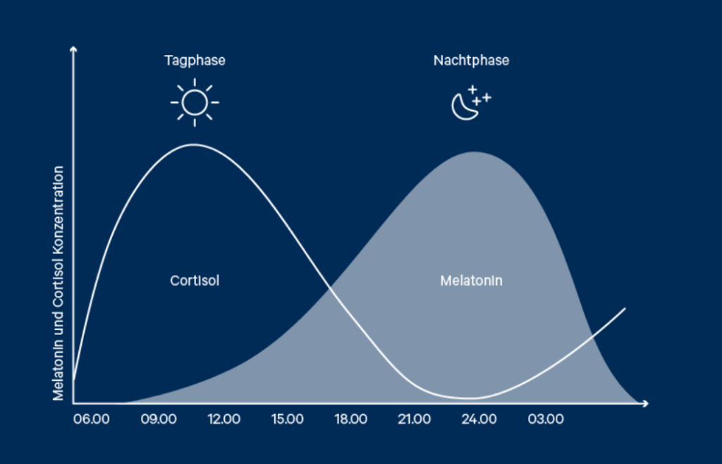 Jeder Mensch hat von Natur aus eine innere Uhr, die darüber bestimmt, ob wir wach oder müde, leistungsfähig oder träge sind. Viele Faktoren beeinflussen diese innere Uhr, darunter insbesondere zwei Hormone: Melatonin, das Schlafhormon, welches abends mit Einbruch der Dunkelheit ausgeschüttet wird und Cortisol, welches auch als Stresshormon bekannt ist und uns mit dem Tagesbeginn in einen fitten und aktiven Zustand versetzt. Beide Hormone wechseln sich im Verlauf des Tages ab: Cortisol steigt morgens an und sinkt zum Abend hin ab, während es bei Melatonin genau umgekehrt ist.
