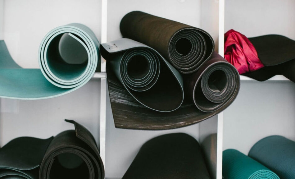 Eine violette Matte, die auf dem Boden ausgerollt wird.